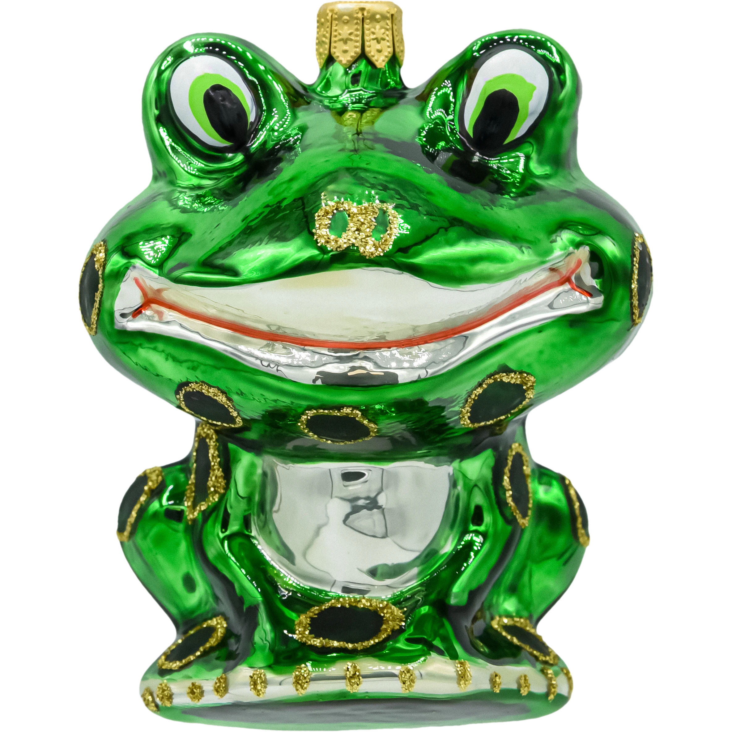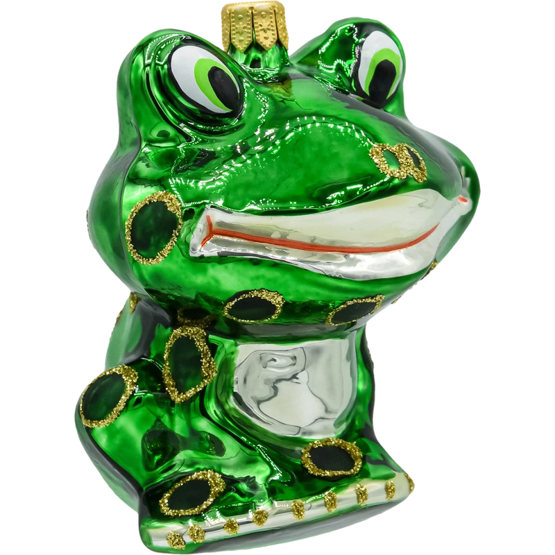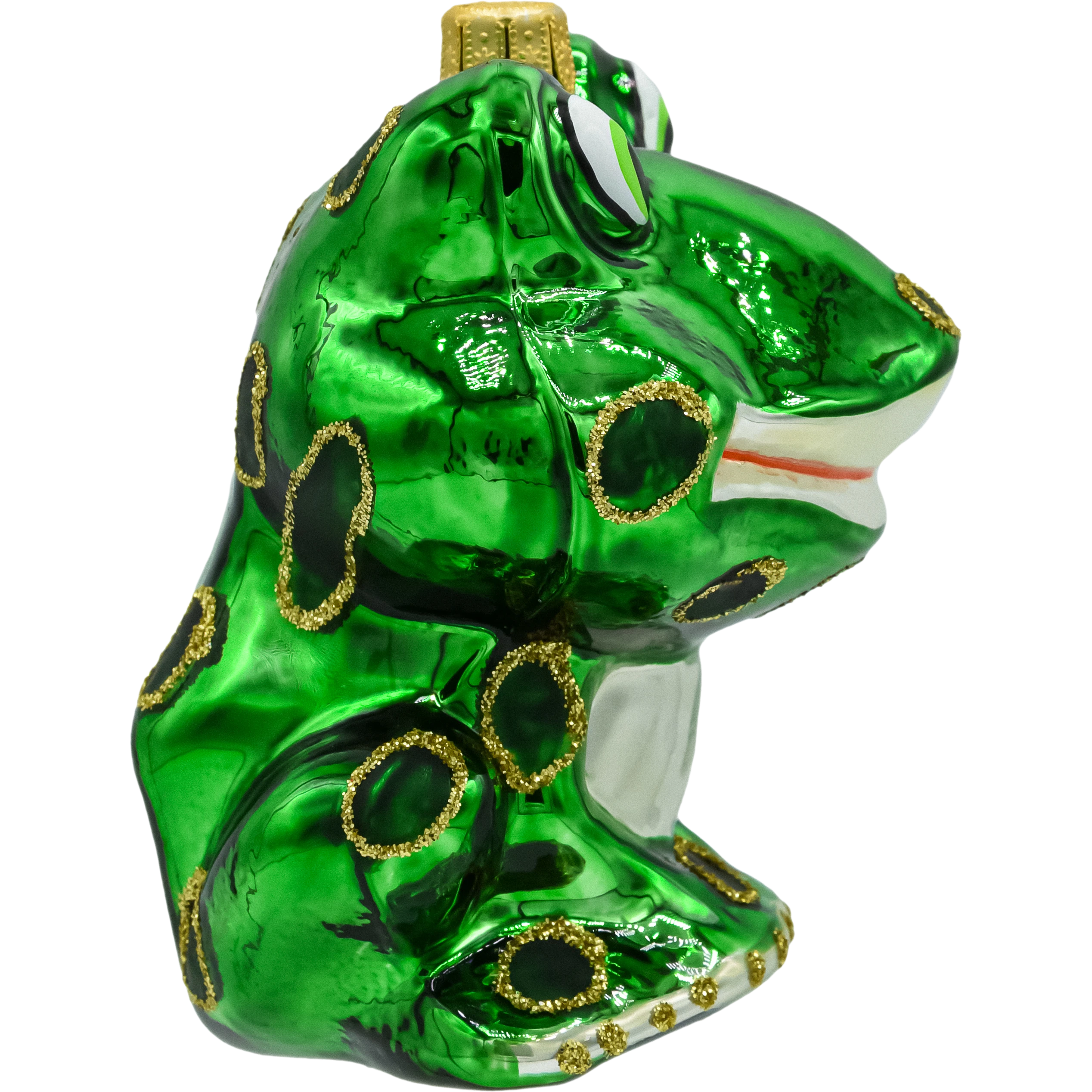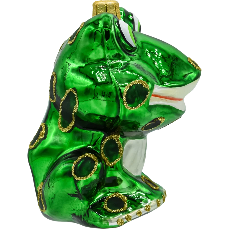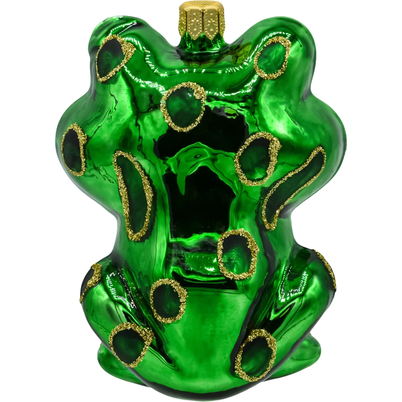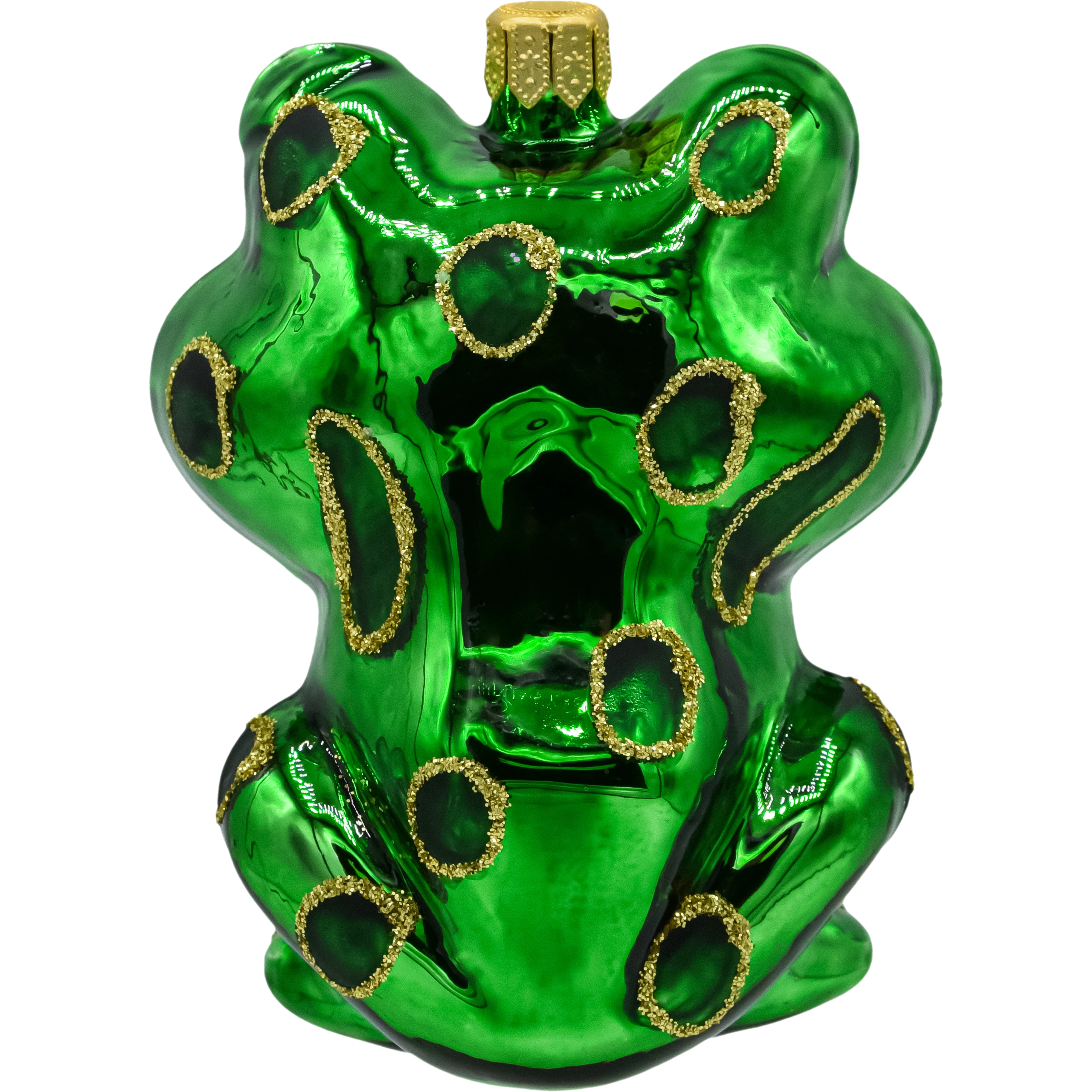 Bombka przedstawia sympatyczną żabkę z szerokim uśmiechem i dużymi, wyrazistymi oczami. Całość utrzymana jest w intensywnym, metalizowanym odcieniu zieleni, podkreślonym złotymi akcentami – kropkami i obwódkami w formie brokatowych zdobień. Elementy te nadają ozdobie elegancji i sprawiają, że pięknie odbija światło lampek choinkowych.