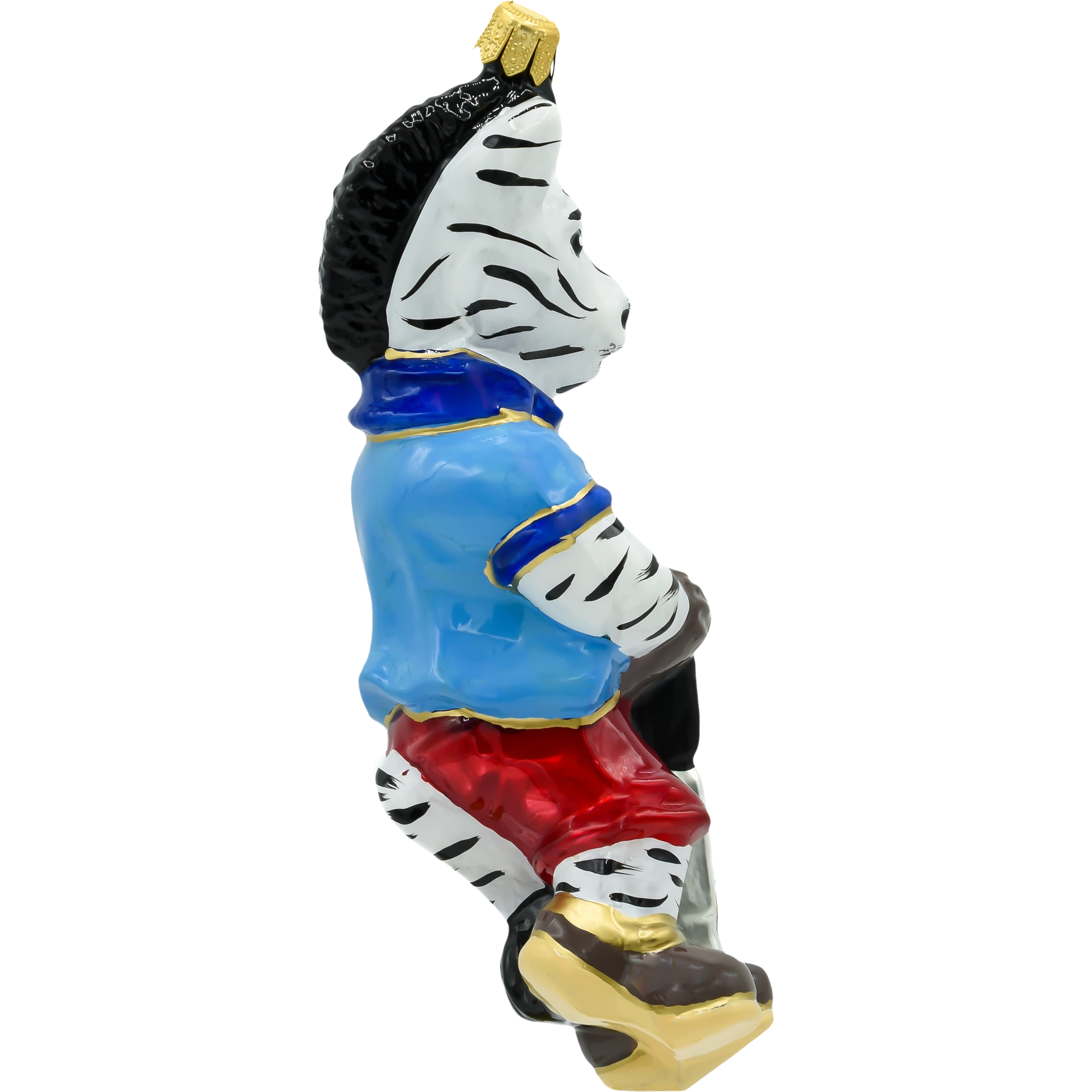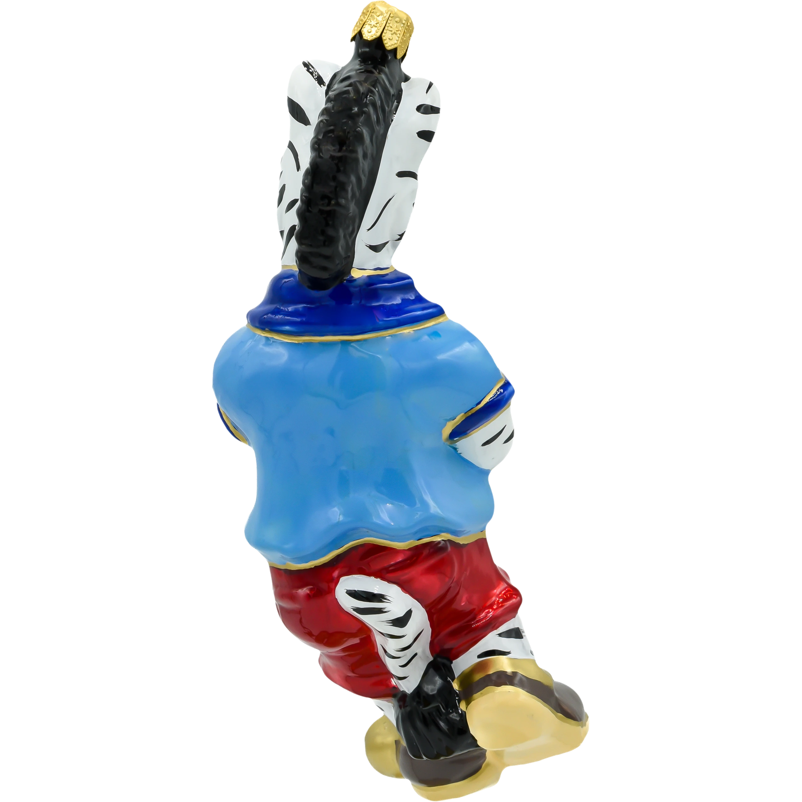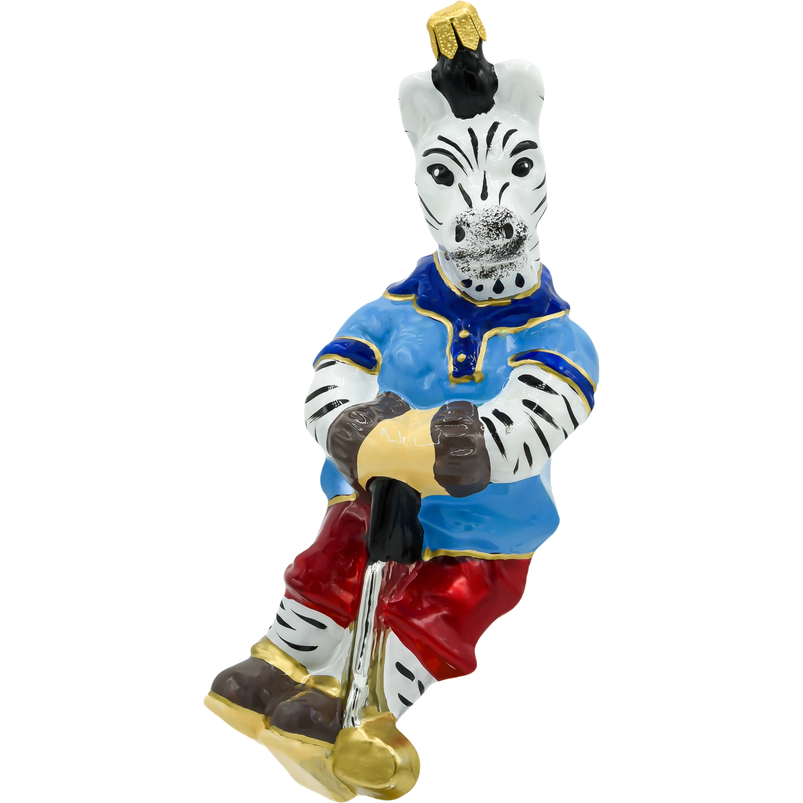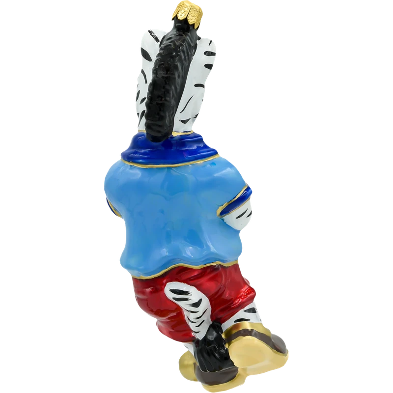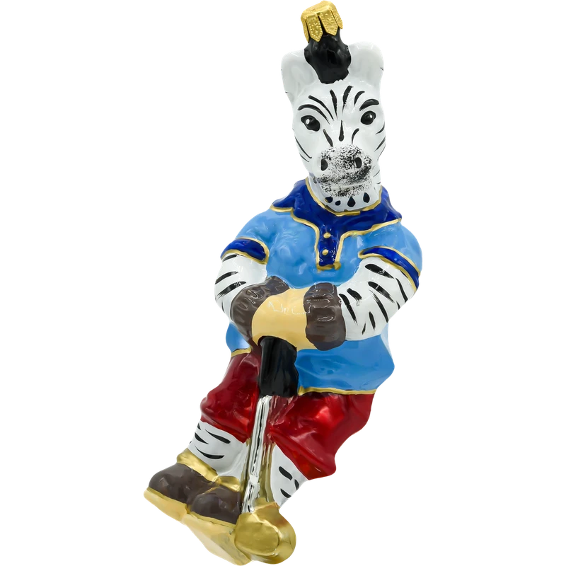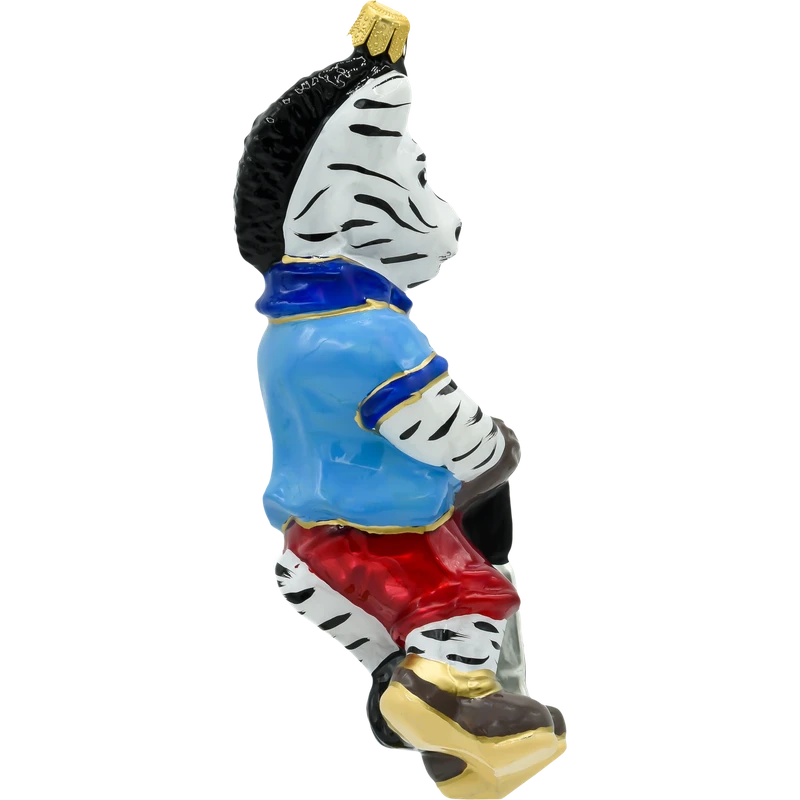 Wyróżnij swoją choinkę nietuzinkową dekoracją – szklaną bombką w kształcie zebry grającej w golfa! Ta zabawna i elegancka ozdoba została wykonana ręcznie z najwyższej jakości dmuchanego szkła, a następnie starannie pomalowana błyszczącymi, intensywnymi farbami. Zebra ubrana jest w sportowy niebieski trykot z detalami w kolorze złota, czerwone spodnie i łyżwy, a w łapach dzierży kij golfowy zakończony złotym krążkiem.