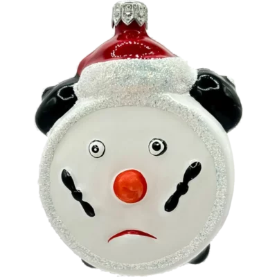 Szklana bombka choinkowa w kształcie uśmiechniętego budzika to bajkowa ozdoba, która wnosi na choinkę nutę nostalgii, humoru i dziecięcej radości. Jej unikalny design łączy klasyczną formę retro zegara z ludzką mimiką – ma duże, radosne oczy, złoty, brokatowy nosek oraz czerwony, serdeczny uśmiech. Rzymskie cyfry i czarne wskazówki podkreślają jej funkcję jako dekoracyjnego zegarka, a czapeczka Świętego Mikołaja w czerwono-białych barwach nadaje jej typowo świąteczny charakter.