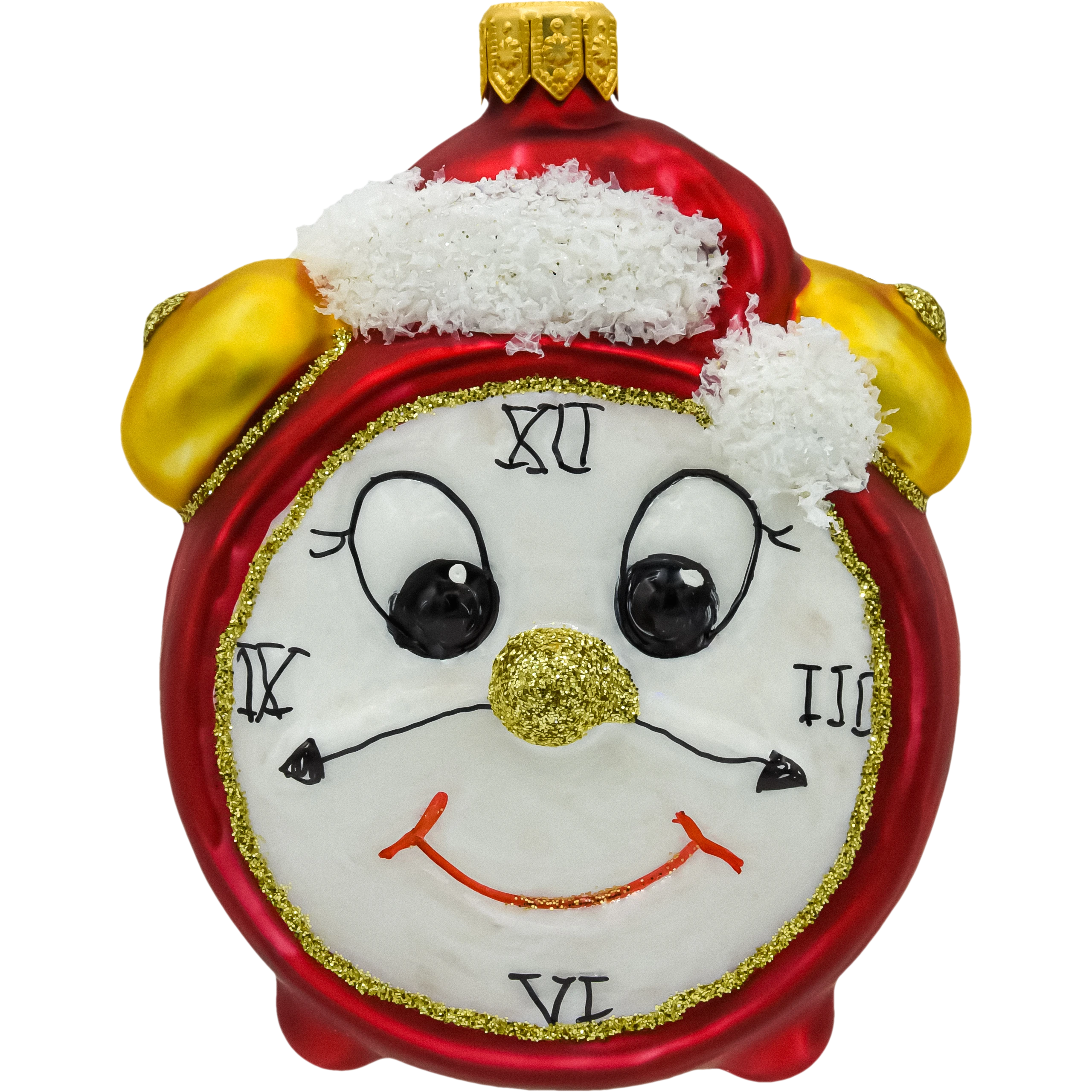 Szklana bombka choinkowa w kształcie uśmiechniętego budzika z twarzą i czapką Mikołaja. Ręcznie malowana, ozdobiona brokatem – idealna jako świąteczna ozdoba lub prezent kolekcjonerski.