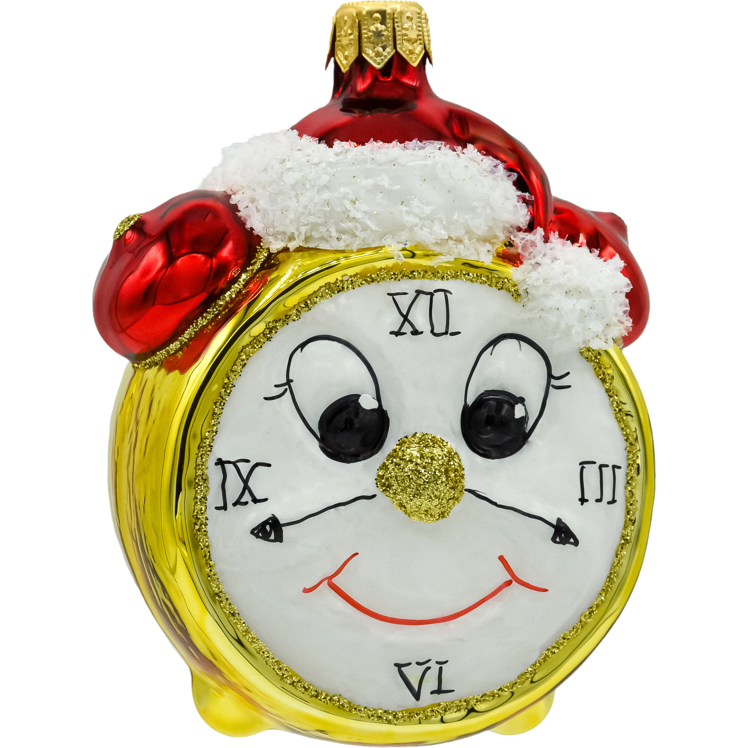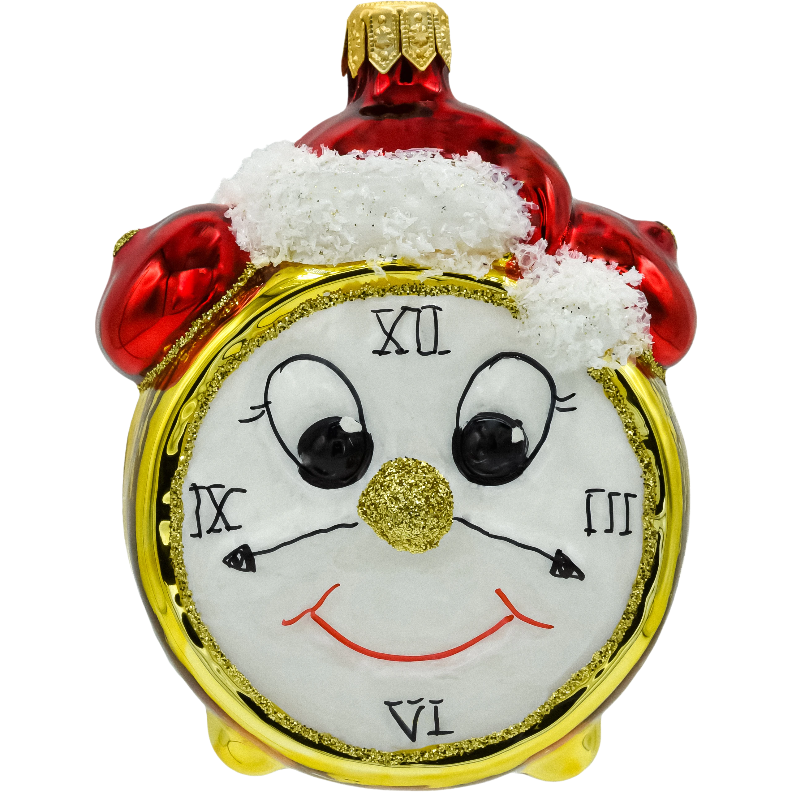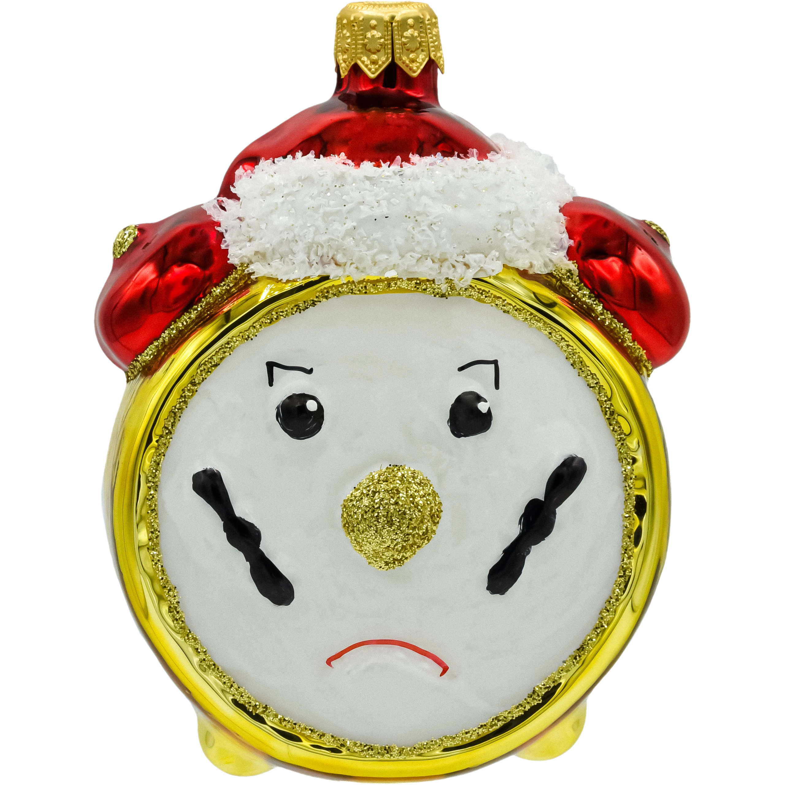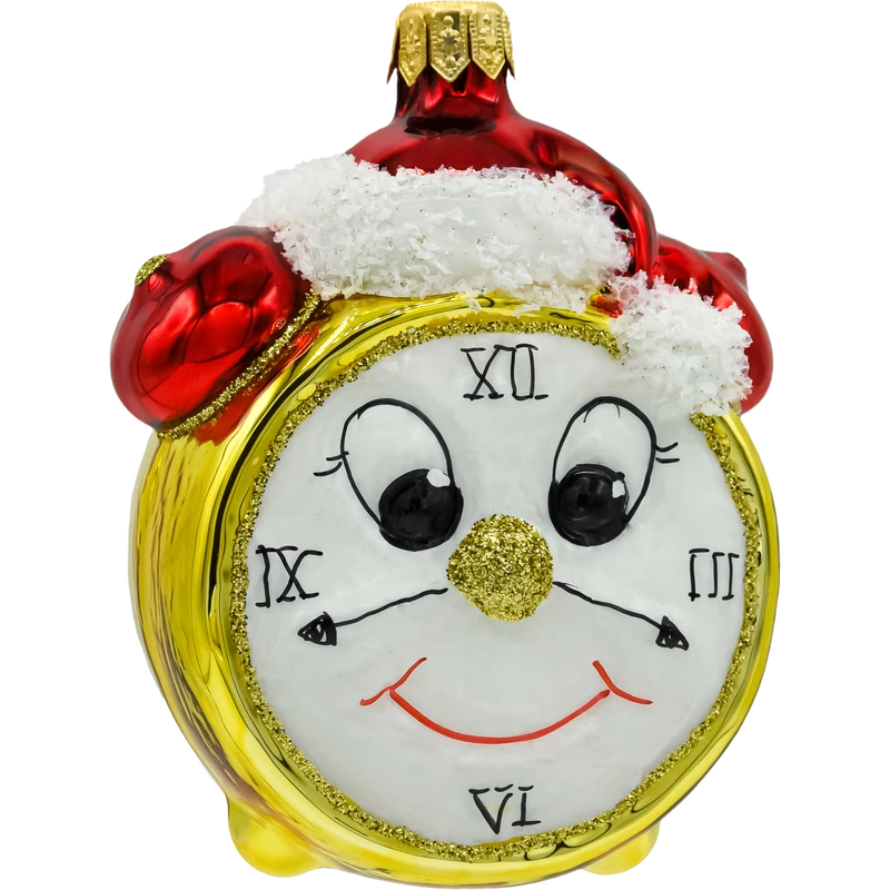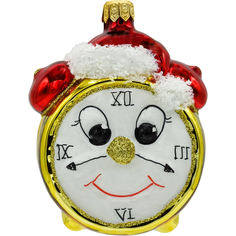 Wyjątkowa szklana bombka choinkowa w kształcie budzika z twarzą. Ręcznie malowana, ozdobiona brokatem, z czapką Mikołaja i dwoma emocjonalnymi wyrazami twarzy. Idealna na prezent i do świątecznej kolekcji!