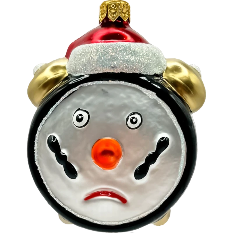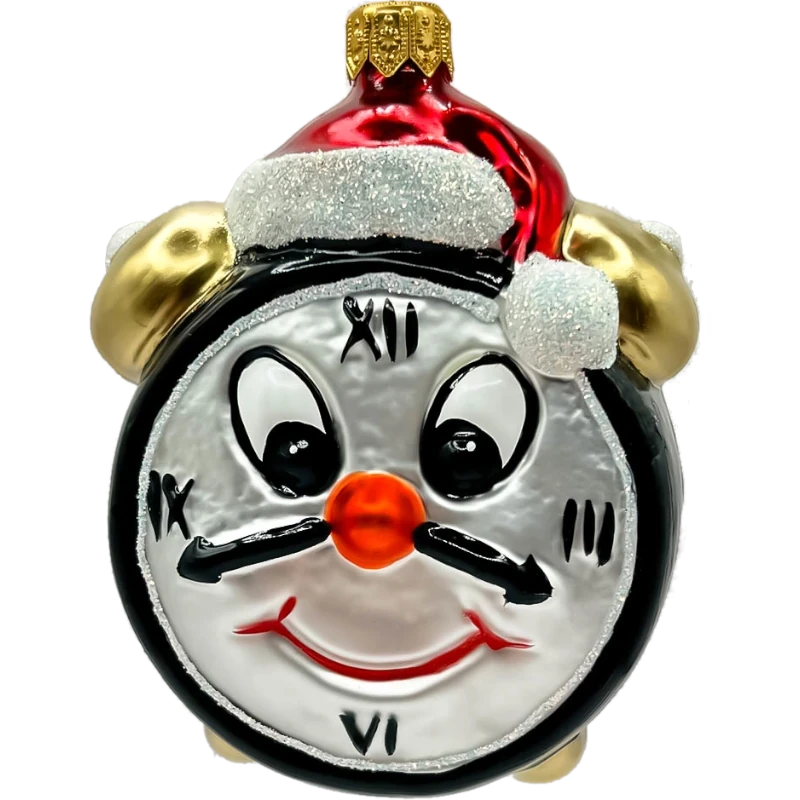 Bombka przedstawia wesoły zegar z uśmiechniętą twarzą, który odlicza czas do najpiękniejszej nocy w roku. Z jednej strony, zegar ozdobiony jest ciepłym, świątecznym czerwonym kapeluszem, natomiast z drugiej, znajdziesz klasyczne wskazówki i numerację, które nadają całości elegancki, a zarazem zabawny charakter.