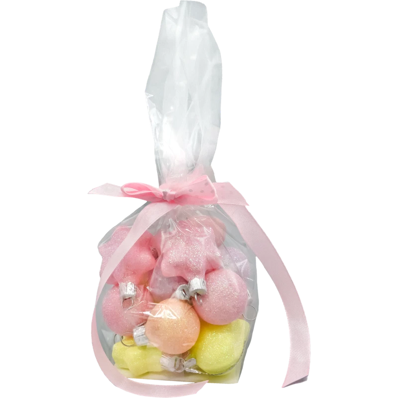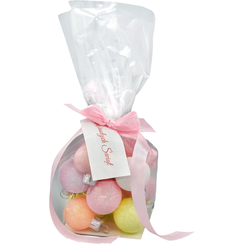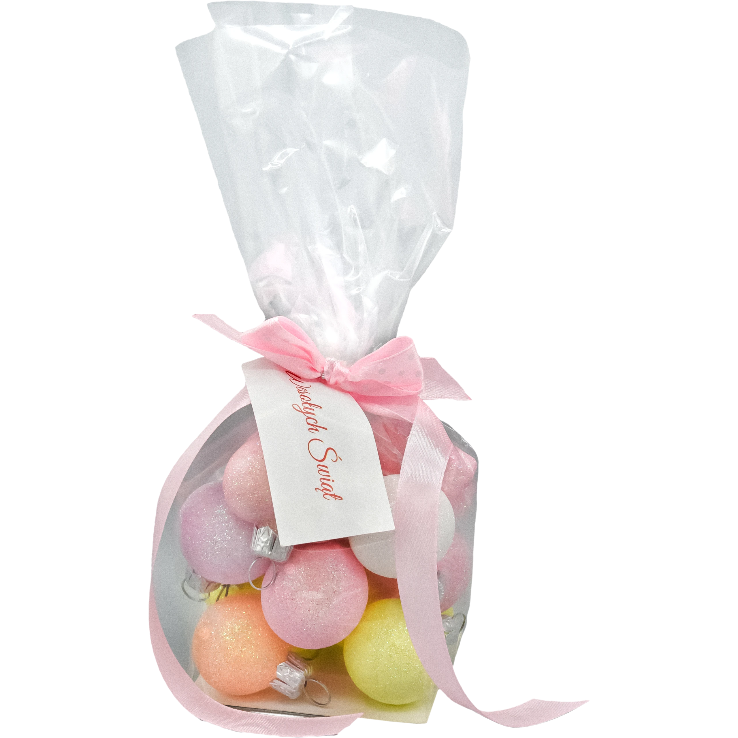Wprowadź do swojego świątecznego wnętrza nutę subtelnego uroku dzięki zestawowi pastelowych bombek choinkowych, zapakowanych w elegancki woreczek celofanowy z uroczą różową wstążką. Ten delikatny komplet zawiera szklane ozdoby w kształcie klasycznych bombek i gwiazdek, utrzymane w kojących, perłowo-pastelowych odcieniach różu, żółci, brzoskwini, bieli i lawendy. Każda bombka jest ręcznie dekorowana subtelnym brokatem, który pięknie odbija światło, tworząc efekt magicznej poświaty.