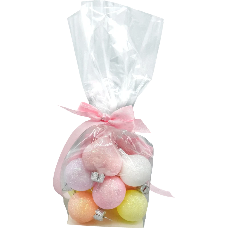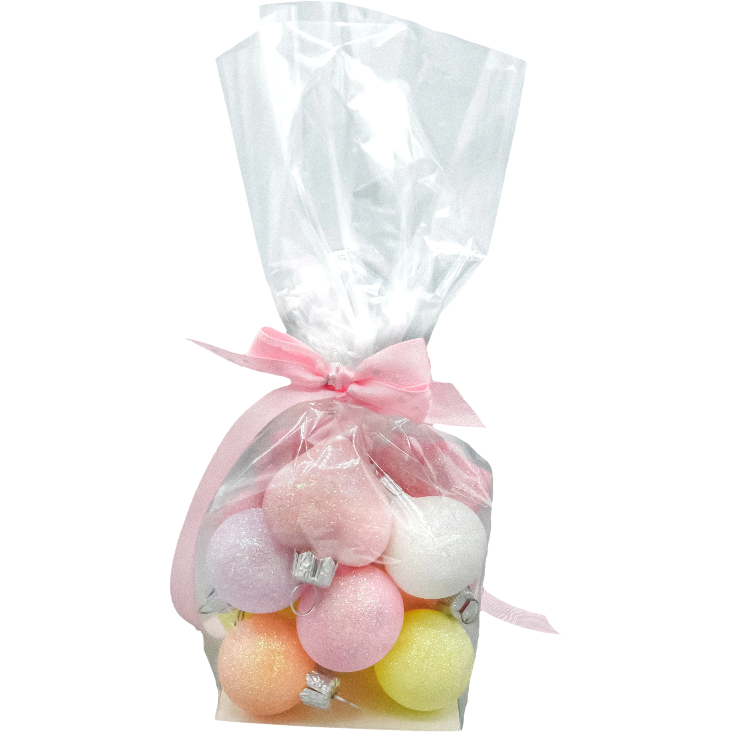 Zestaw pastelowych szklanych bombek choinkowych w celofanowym woreczku – urocza dekoracja świąteczna i gotowy pomysł na prezent. Ręcznie zdobione bombki o średnicy 3 cm w eleganckich kolorach.