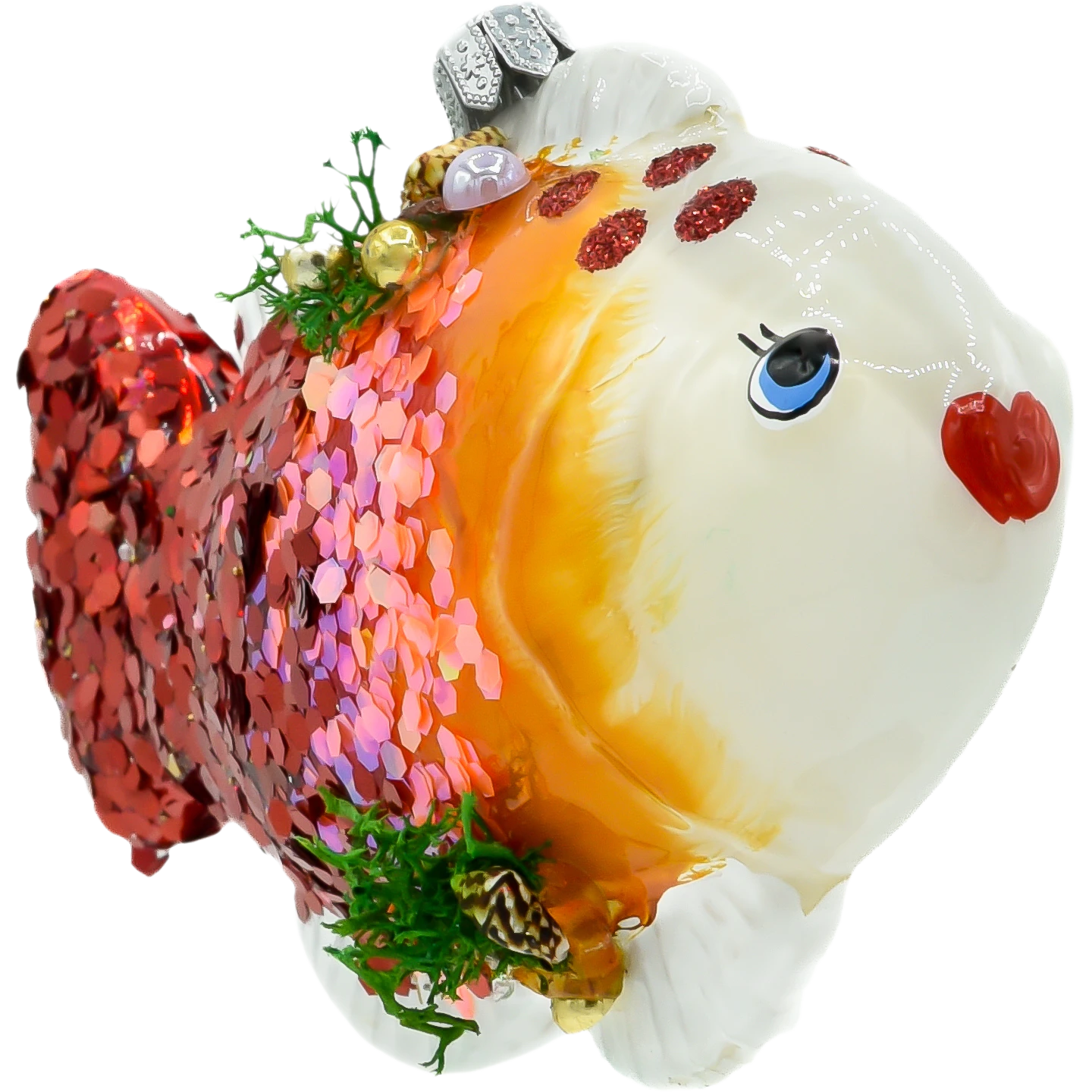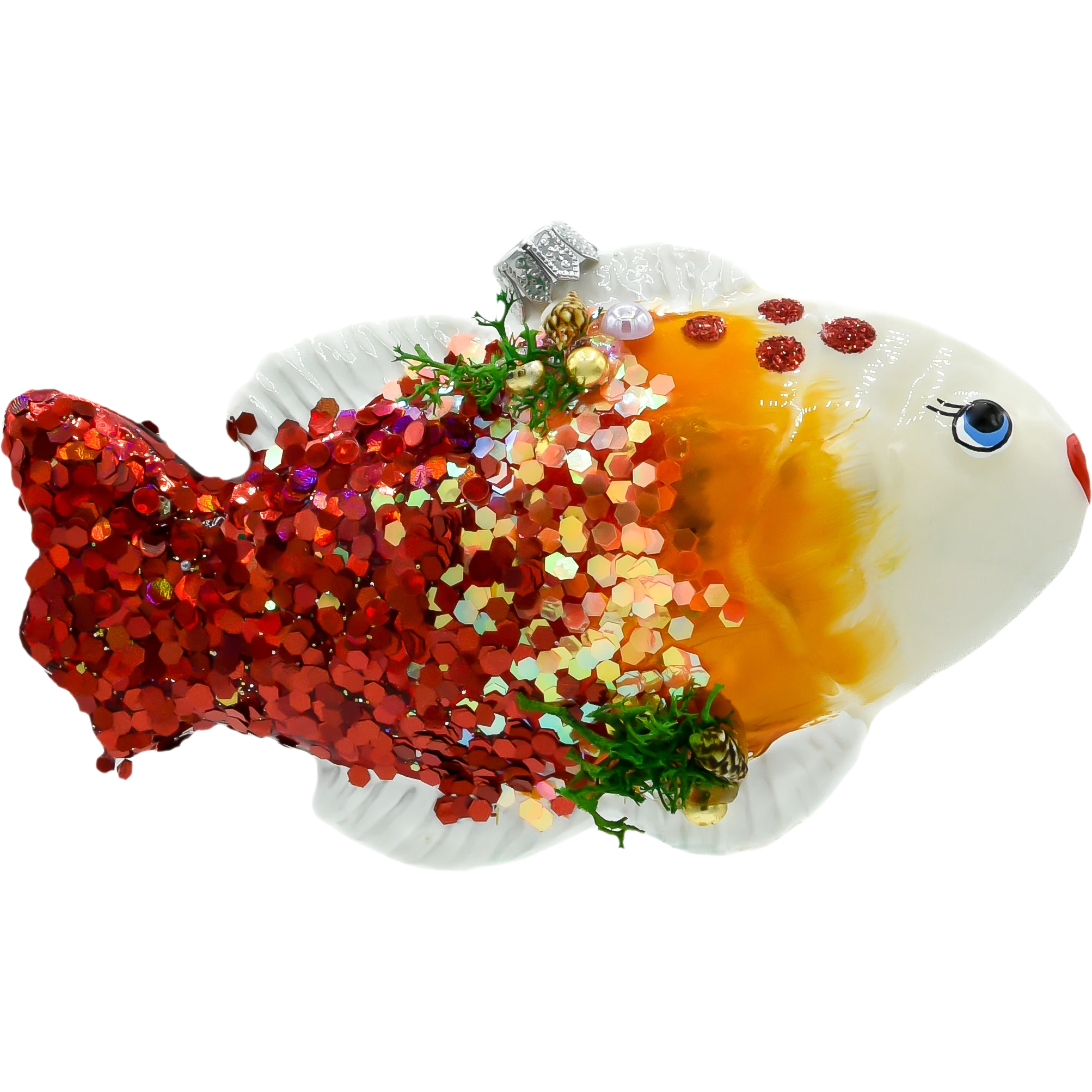 Szklana bombka choinkowa „Złota Rybka” to wyjątkowa dekoracja świąteczna, która łączy tradycyjne rzemiosło z nowoczesnym, kolorowym wzornictwem. Dzięki ręcznemu malowaniu oraz ozdobieniu mieniącymi się brokatowymi łuskami i błyszczącymi cekinami, ta bombka wyróżnia się spośród klasycznych ozdób choinkowych.