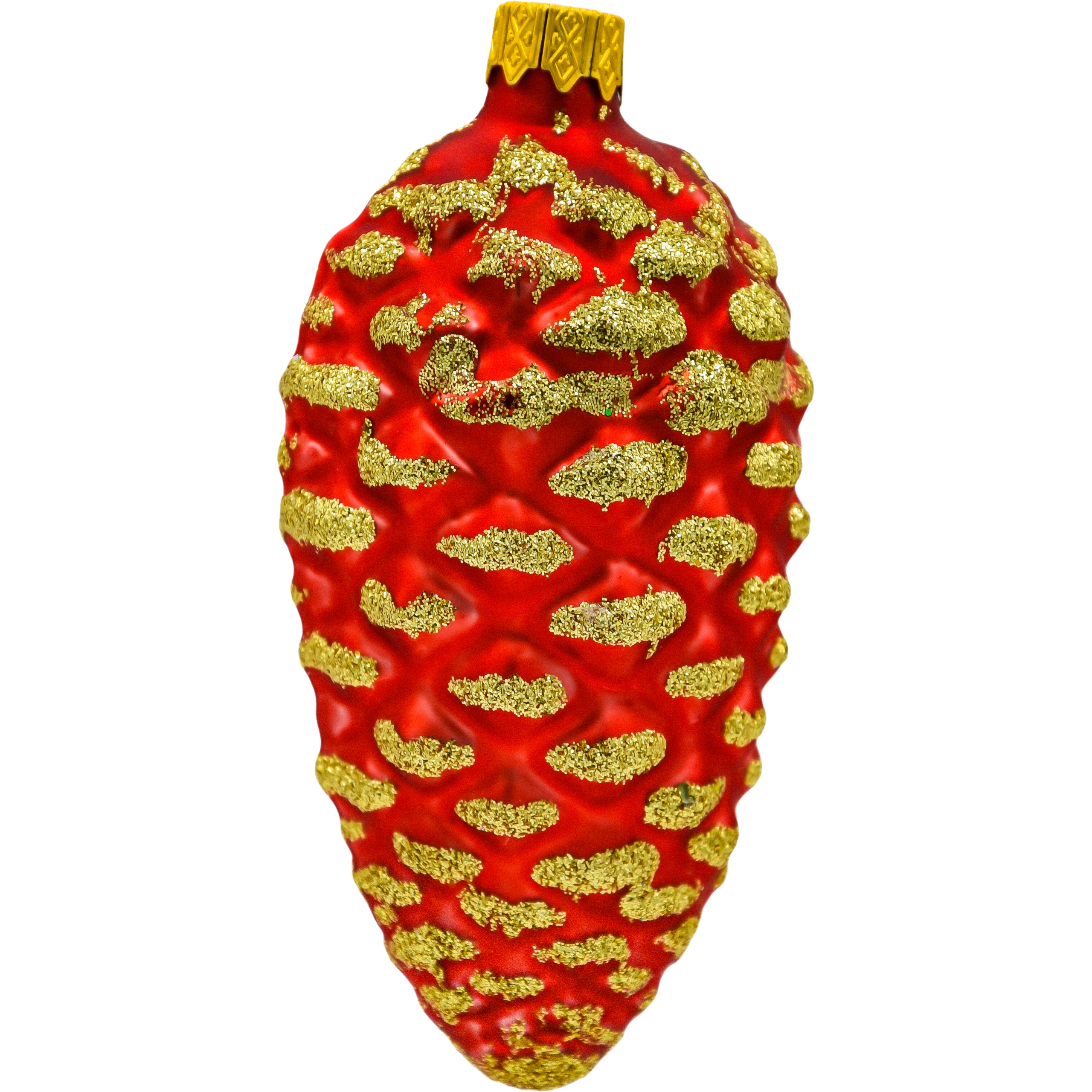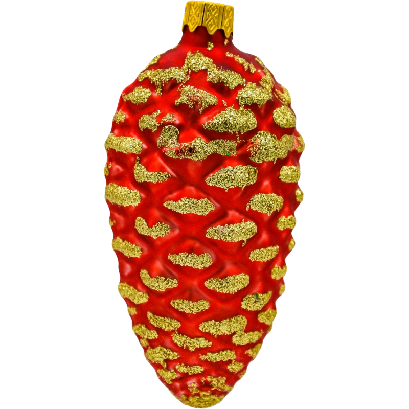 Ręcznie malowana bombka choinkowa w kształcie czerwonej szyszki ze złotym brokatem to elegancka ozdoba świąteczna, która łączy w sobie klasykę i blask. Idealna do choinki w stylu glamour, vintage lub tradycyjnym. Ponadczasowa dekoracja bożonarodzeniowa wykonana ze szkła.