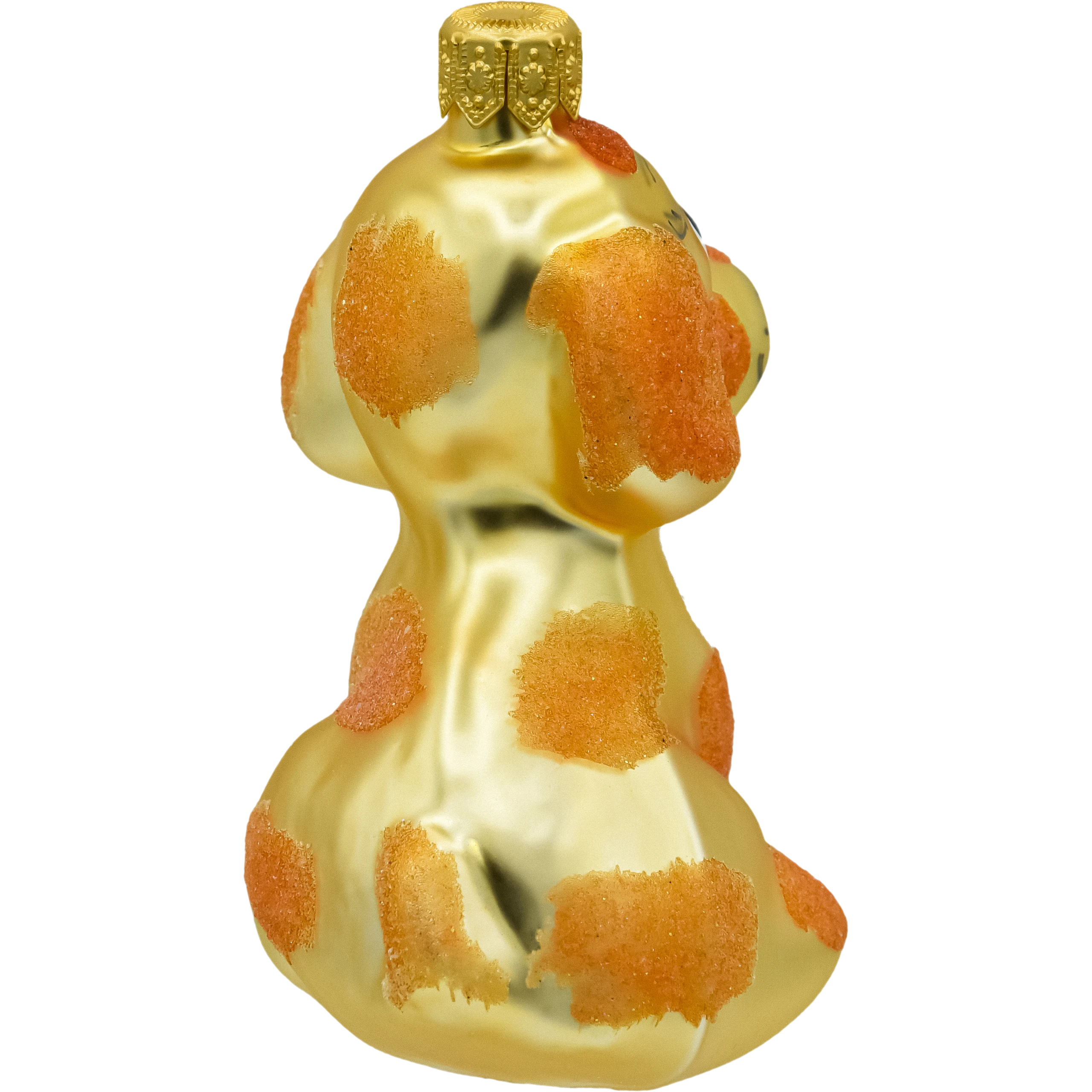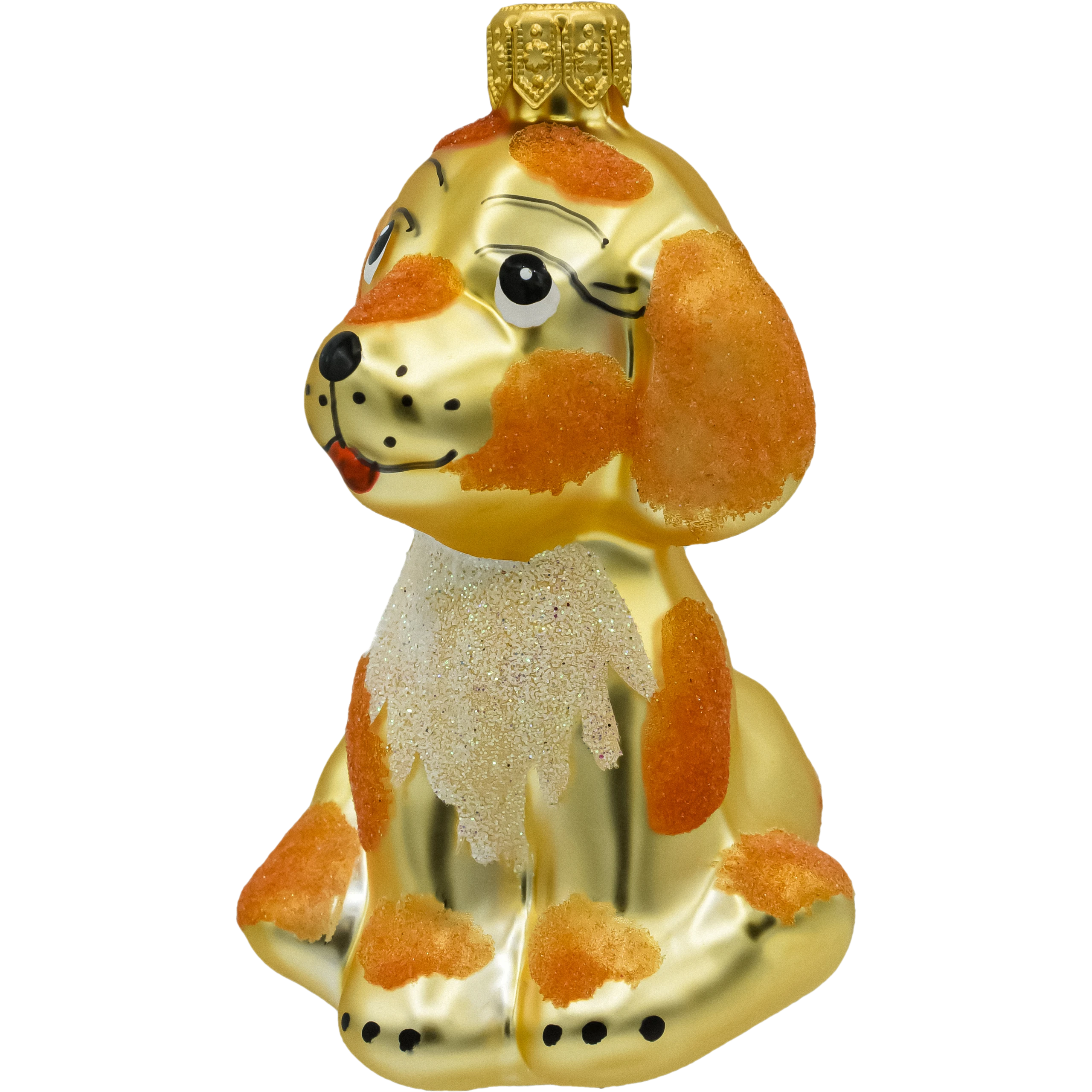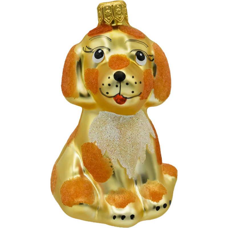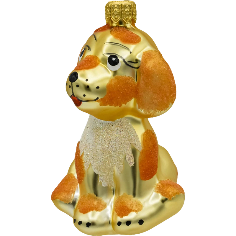 Szklana bombka choinkowa w kształcie uroczego pieska – ręcznie malowana figurka w złotym kolorze z brokatowymi łatkami. Idealna ozdoba świąteczna dla miłośników psów i unikalnych dekoracji choinkowych.