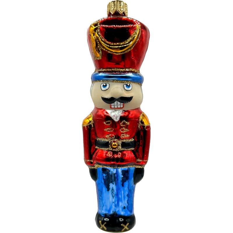 Bombka przedstawia żołnierza w czerwono-niebieskim stroju, z bogatymi złotymi zdobieniami, które nadają jej elegancji i blasku. Czerwona wysoka czapka zbrojna w złote akcenty przyciąga wzrok, a czarne wąsy i charakterystyczna, uśmiechnięta twarz żołnierza podkreślają jego dostojność. Niebieskie spodnie kontrastują z czerwonym mundurem, tworząc harmonijną kompozycję kolorystyczną. Dodatkowo, bombka jest ozdobiona drobnymi brokatowymi elementami, które pięknie mienią się w blasku choinkowych lampek.
