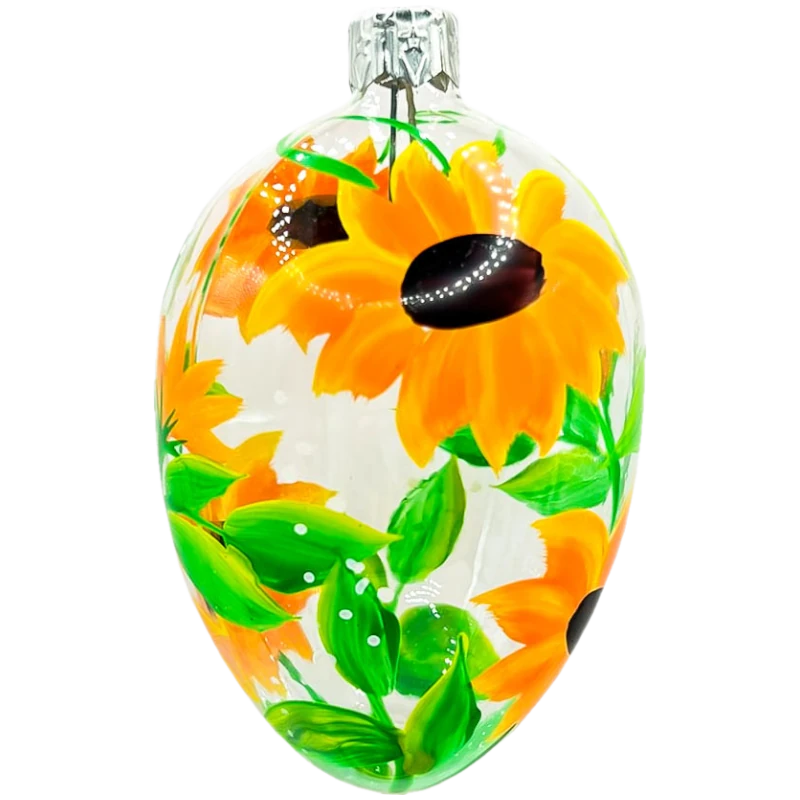 Bombka wielkanocna z kwiatowym motywem. Idealna ozdoba na powitanie wiosny. Szklana baza została w całości pokryta pięknymi, ręcznie malowanymi żółtymi stokrotkami – gatunkiem znacznie rzadnym niż biały odpowiednik.